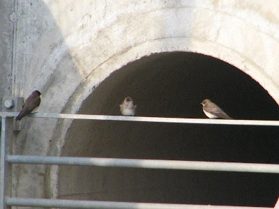I had never identified a Rough-winged swallow until this spring. They are similar in colour to the Bank Swallow but lack the dark neck band. They hold their wings at a different angle when in flight. They are very active and difficult to find sitting still but will swoop within a couple of feet of your face. I did manage to get the shot above shot near a city pond. A trio of Rough-winged Swallows perched on the grate across the aquaduct that was under the pathway at the same pond.